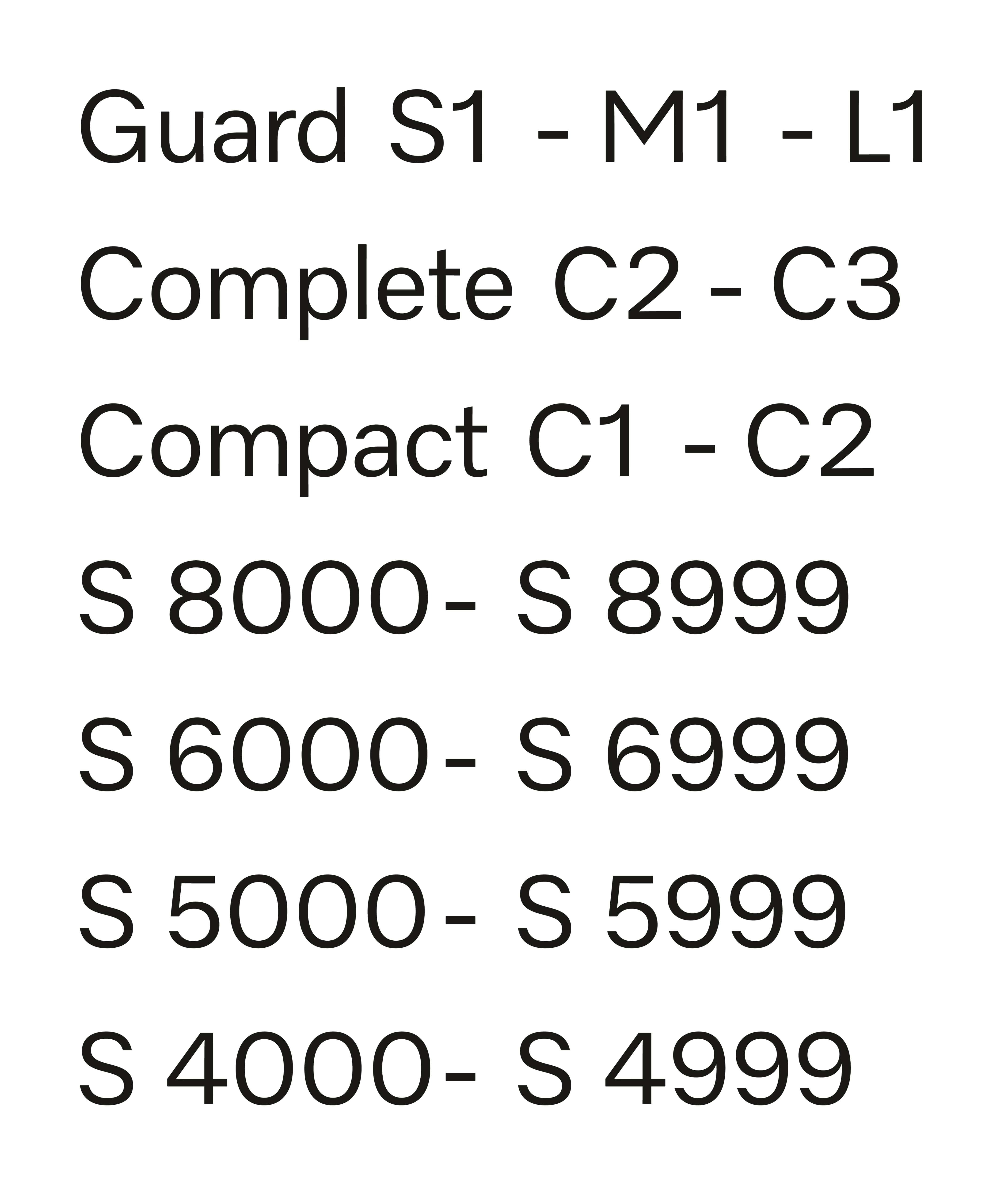 Complete C2, Complete C3, Compact C1, Compact C2, Guard S1, Guard M1, Guard L1